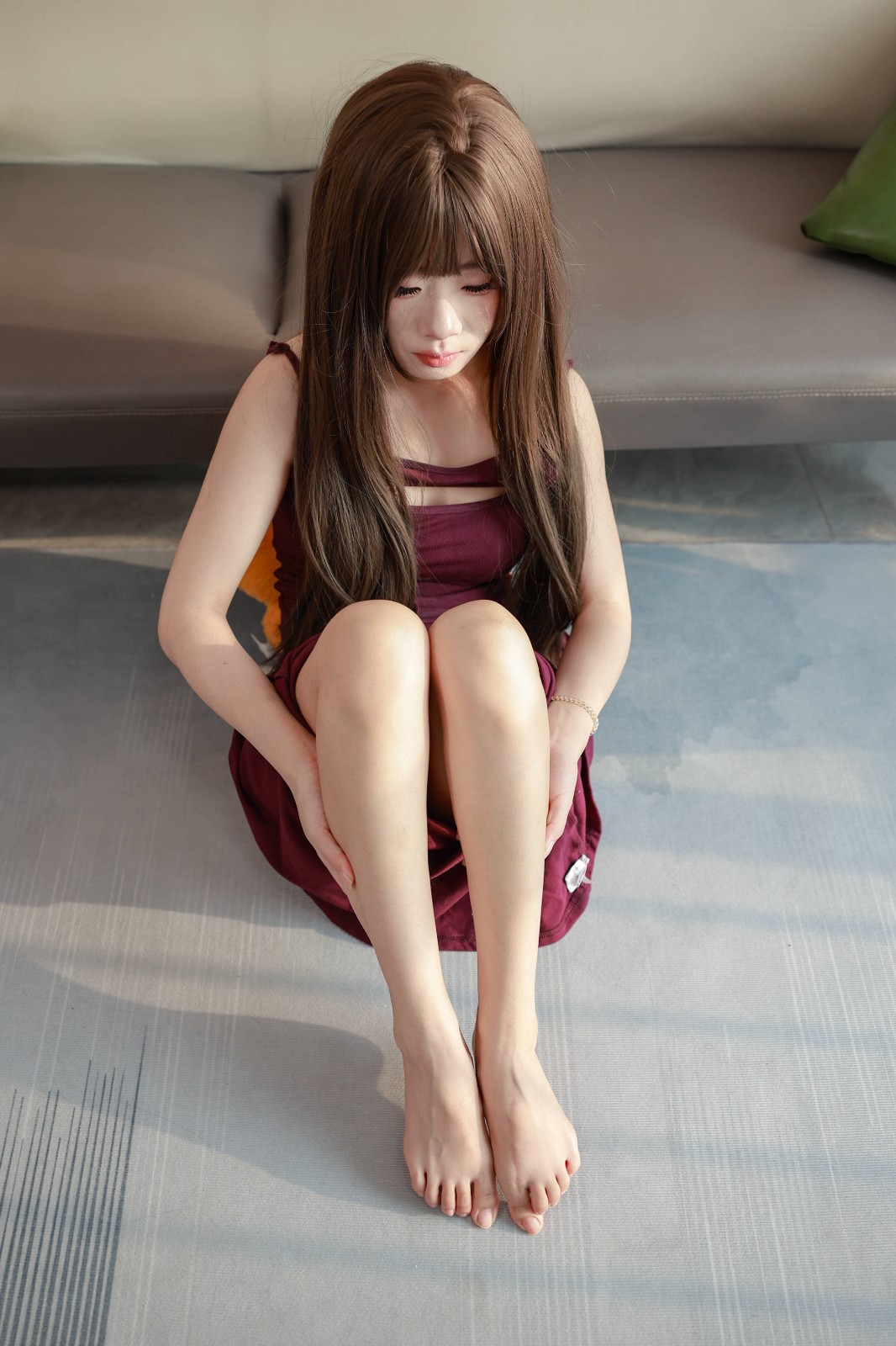 ❀服装:酒红色连衣裙 裸足 黑色高跟鞋